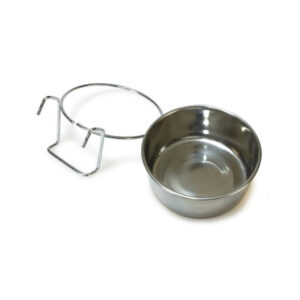 - Comedero o bebedero de acero inoxidable para jaulas de aves.
