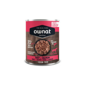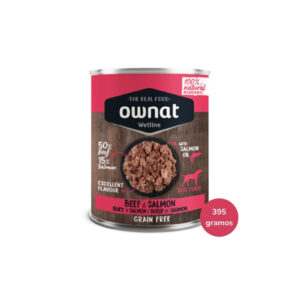 Buey (50%), caldo (28,8%), salmón (15%), arándanos (5%), minerales, aceite de salmón (0,2%)