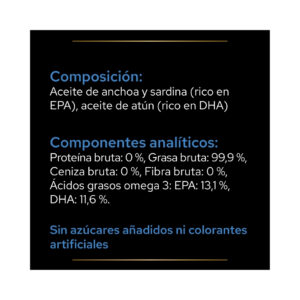 - Preserva de forma natural un estado emocional positivo y ayuda a calmar los comportamientos nerviosos, gracias a una selección de aceites de pescado, ricos en ácidos grasos omega-3 EPA y DHA.