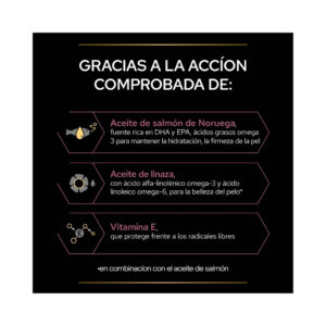 - Promueve la salud de la piel: hidratación y firmeza. Favorece el brillo y suavidad del pelo gracias al aceite de pescado, más concretamente al aceite de salmón noruego, al aceite de linaza rico en omegas-3 y 6 y a la vitamina E.
