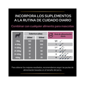 Apropiado para un refuerzo diario y cuando tu perro más lo necesite: en caso de cambios en el estado de su pelaje, incluidos un pelaje sin brillo y una piel sensible. - ¿Cómo administrar Skin & Coat+ a mi perro? Adminístralo una vez al día junto con una de las comidas de tu perro. Deposita el aceite encima del alimento de tu perro. Para obtener mejores resultados, utilízalo de forma continua como parte de la rutina de alimentación diaria.