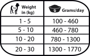 - Tenga en cuenta que esta tabla de dosificación es orientativa y que la cantidad de alimento puede variar en función de la actividad, raza del perro y condiciones medioambientales.