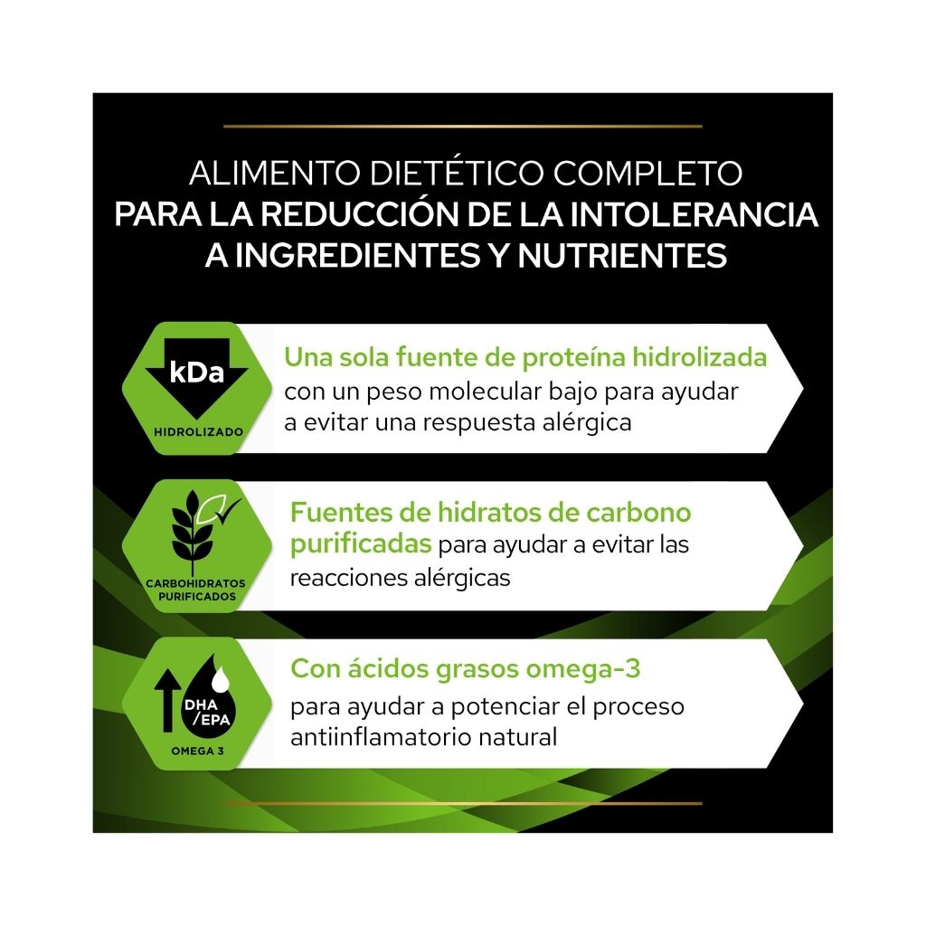 - Una sola fuente de proteína hidrolizada con un peso molecular bajo para ayudar a evitar una respuesta alérgica.
