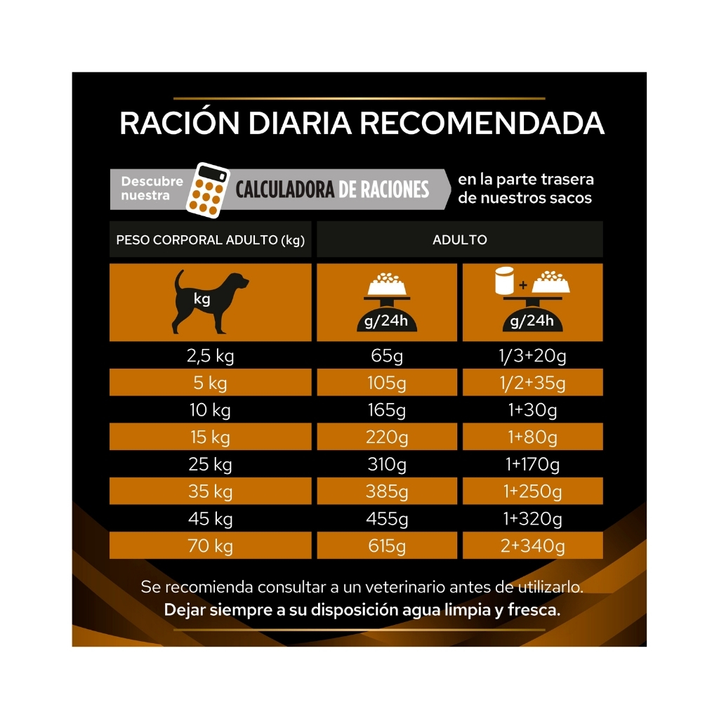 - Para perros de más de 70 kg: Por cada 5 kg adicionales de peso corporal, añadir 25 gramos de alimento seco.