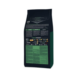 Pollo fresco* (60 % mín. antes de la extrusión), arroz integral* (12 %), patata deshidratada* (8 %), maíz entero* (5 %), guisantes enteros* (5 %), grasa avícola (preservada con antioxidantes naturales), aceite de salmón (preservado con antioxidantes naturales), levadura de cerveza* (1,5 %), pulpa de remolacha, verduras frescas antes de la extrusión (calabaza* 0,5 %), sal gema*, raíces de achicoria (FOS)*, extracto de levadura (MOS), algas marinas deshidratadas*, glucosamina (500 mg/kg), yucca shidigera, jengibre* (150 mg/kg), bayas de goji* (150 mg/kg), condroitín sulfato (100 mg/kg). *Ingredientes naturales