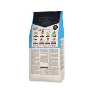 Carnes 39% (carnes deshidratadas 29%, pollo fresco* 10% antes de la extrusión), arroz integral* (12%), trigo integral* (9%), grasa de pollo, maíz integral* (8%), salvado de trigo* (8%), cebada integral* (7%), guisantes enteros* (2%), manzana* (1%), aceite de salmón, semilla de lino* (1%), pulpa de remolacha, fructo y manano oligosacáridos, levadura de cerveza* (0,5%), plantes aromáticas 0,02% (hinojo*, equinácea*, tomillo*), yucca schidigera. *INGREDIENTES NATURALES