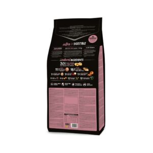 Pollo deshidratado (24 %), pollo fresco* (15 % mín. antes de la cocción), pavo fresco* (15 % mín. antes de la cocción), arroz integral* (11 %), patata deshidratada* (8 %), raíces de mandioca* (8 %), grasa avícola (preservada con antioxidantes naturales), hidrolizado de salmón, verduras y frutas frescas antes de la cocción (manzana* 1 %, zanahoria* 0,5 %, calabaza* 0,5 %), salmón deshidratado (2 %), proteína hidrolizada de pollo, levadura de cerveza* (1 %), huevo deshidratado* (1 %), semilla de lino* (1 %), aceite de salmón (preservado con antioxidantes naturales), sal gema*, raíces de achicoria (FOS)*, extracto de levadura (MOS), algas marinas deshidratadas* (500 mg/kg), glucosamina (500 mg/kg), yucca shidigera, condroitín sulfato (100 mg/kg), arándanos* (100 mg/kg), té verde* (80 mg/kg), equinácea* (80 mg/kg), flor de manzanilla* (80 mg/kg), hinojo* (80 mg/kg). *Ingredientes naturales
