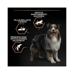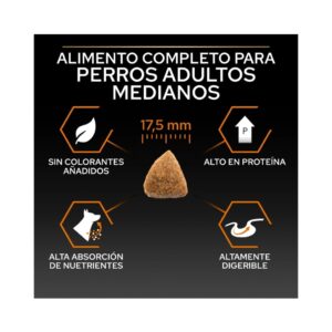 Pienso seco completo y equilibrado para perros adultos de raza mediana, diseñado para mantener su salud diaria, vitalidad y condición física óptima.