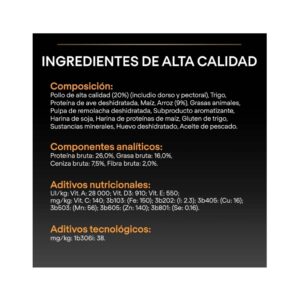 Pollo (20%), trigo, proteína de ave deshidratada, maíz, arroz (9%), grasas animales, pulpa de remolacha deshidratada, harina de soja, harina de proteínas de maíz, gluten de trigo, huevo deshidratado, aceite de pescado, minerales.