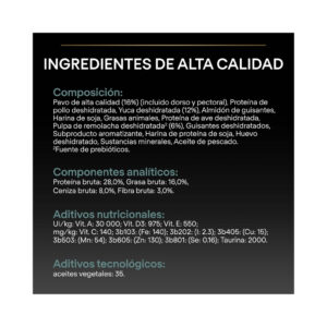 - Fácilmente digestible. Formulada con ingredientes específicos para la mejora del equilibrio de la microflora intestinal.