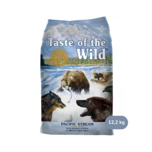 - Taste of the Wild Pacific Stream con proteína de pescado, sin cereales y con patata proporciona energía altamente digerible para perros sensibles.