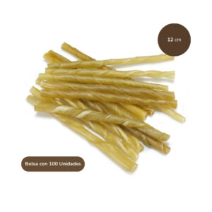 Palitos en espiral de piel bovina. Ideales como recompensa para los perros. Su consumo evita la formación de sarro, manteniendo las encias fuertes y los dientes sanos y limpios