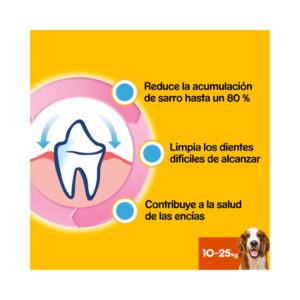 - Snack dental para perros medianos que favorece la higiene oral y contribuye a mejorar el aliento del perro.