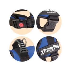- Arnés para perros extra resistente, ergonómico y ajustable en cuello y barriga mediante velcro y cierre de plástico.
