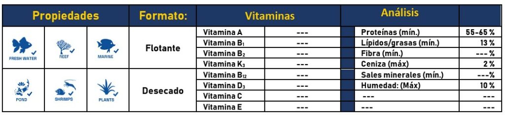 - Análisis: Proteínas 55–65 %, Grasas 13 %, Cenizas 2 %, Humedad 10 %.