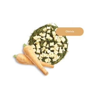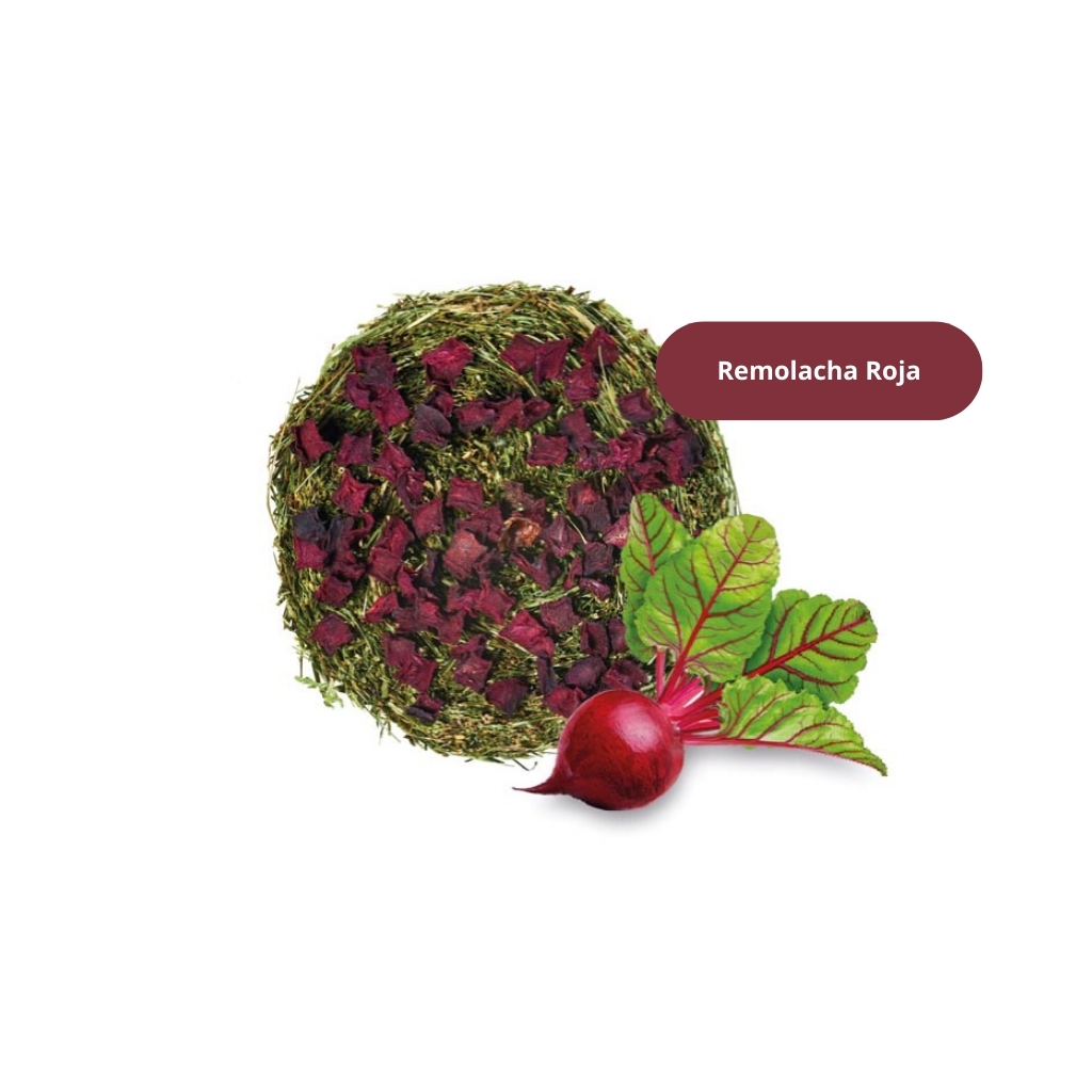 Heno de prado, chirivía, remolacha, fibra de palma y almidón.
