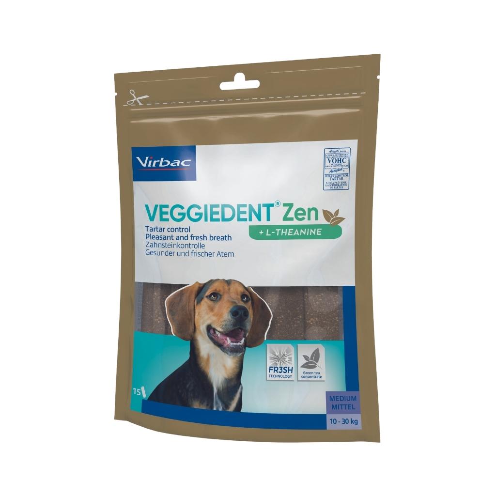 Veggiedent Zen es un snack premium y multifuncional científicamente probado que incorpora, gracias a la L-teanina, beneficios saludables al cuidado dental diario para el bienestar de los perros más inquietos.