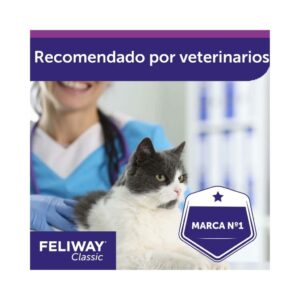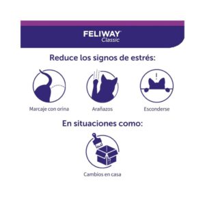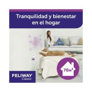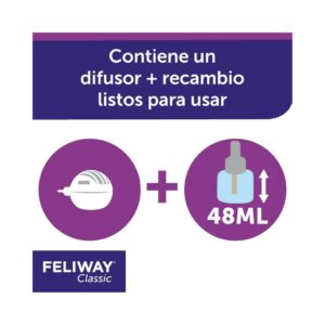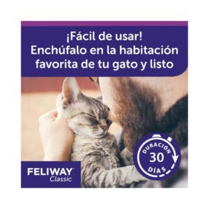 - Feliway Classic Difusor libera un mensaje de felicidad, similar a la feromona facial que producen los gatos de forma natural.