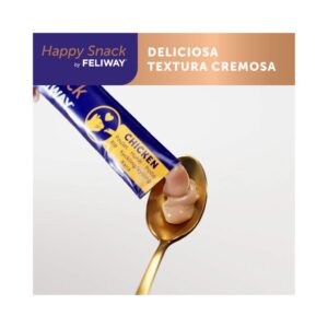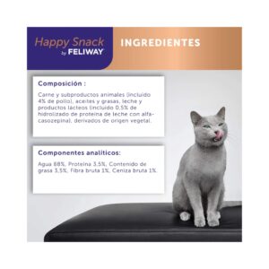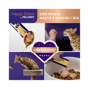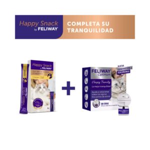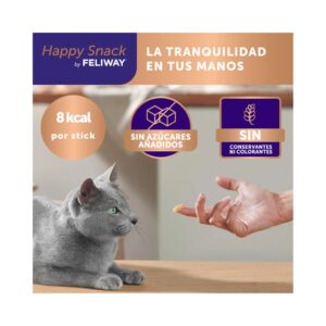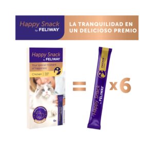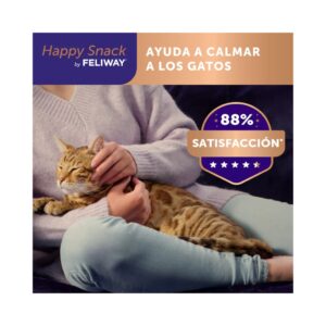 - Cuando uses Happy Snack by Feliway para reconfortar a tu gato en situaciones difíciles o estresantes, empieza a darle el cremoso premio unos días antes.